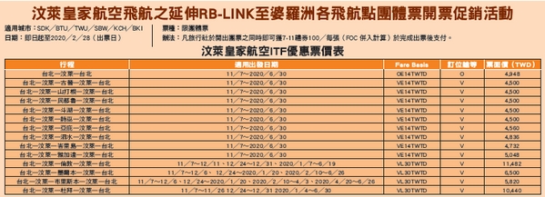 汶萊皇家航空針對ITF旅展推出汶萊自由行專案,讓旅客自由搭配飯店,符合預算彈性玩法,歡迎同業洽詢展瑞旅行社櫃台。亦推出中轉婆羅洲、歐澳、中東的優惠票價,最低只要4,500元起。另外汶萊航空可針對有意銷售團體遊之同業,依需求安排客製化之團體票價,歡迎同業洽詢。