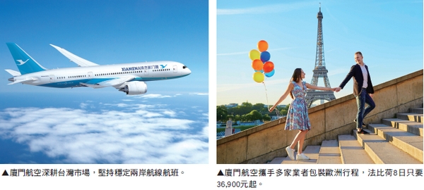 值得一提的是,廈門航空也攜手業者推出精彩歐洲產品:法比荷8日36,900元起、荷德比法10日39,900元起、荷比盧10日44,900元起、法比荷9日48,900元起等,行程豐富優質、價格更超值,出團穩定,請洽友泰旅遊、可樂旅遊、雙獅旅行社。