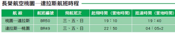 值得一提的是,長榮達拉斯航線為清晨抵達桃園機場,旅客將可搭配長榮航空東北亞、東南亞的綿密航網,轉機至亞洲各大城市,有利於吸引商務客及觀光客來台轉機的客源,有效發揮台灣轉運樞紐的價值及特色。
