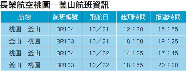看準赴韓旅遊熱潮,長榮航空10/2 1起開航桃園─釜山航 線,即日起正式開賣,提供每日1班的飛航服務,這也是長 榮航空睽違13年再度開闢韓國新航點,屆時可搭配松山─首爾金 浦以及桃園、高雄飛往首爾仁川航班,每週飛往韓國將達32班。 韓國向來是台灣民眾最喜愛的旅遊景點之一,根據韓國觀光 公社統計,尤其以釜山的成長幅度最為驚人,平均每4位訪韓的 台灣旅客中,就有1位前往釜山旅遊,展現出釜山在台灣市場的 人氣持續升溫,此次釜山航線的開闢,除可搭配現有長榮航空松 山、桃園及高雄直飛首爾的航班外,對於歐美、東南亞國家出發 延遠至韓國的旅客來說,不管是出差或是旅遊皆能有更便利多元 的選擇。