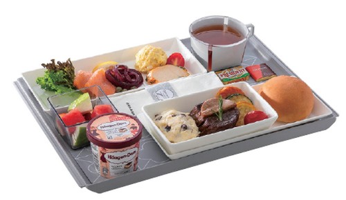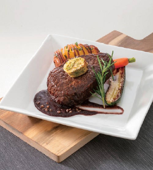 豪華經濟艙主菜「嫩煎牛小排佐鵝肝慕斯及BBQ醬」,復刻中世紀法國名菜的雋永風華,其中牛排料理主要是供應長程線的商務艙,此次特別於豪華經濟艙加碼推出。