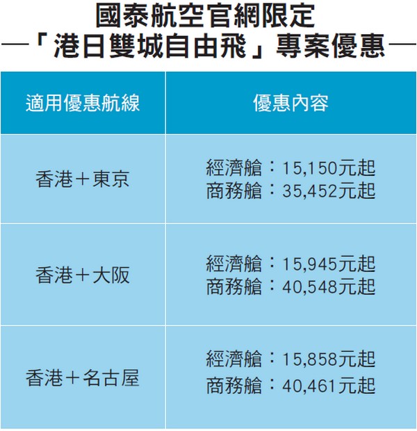 ▲國泰航空推「港日雙城自由飛」專案,一次預訂香港+日本機票組合優惠15,150起。
