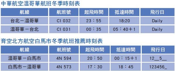 華航客運處協理陳雅妮指出,現台北出發的溫哥華航線由寬敞的B777機型執飛,全艙等旅客在機上可直接免費上網或傳輸文字訊息,享受零時差的即時連線服務。華航每日提供溫哥華「晚去晚回」的直飛航班,無論是當日轉機直達,或選擇停留溫哥華中轉,皆能讓旅客能輕鬆銜接育空北方航空自溫哥華往返白馬市的班機。抵達白馬市後,旅客更能再搭乘育空北方航空的區域航段前往道森市、奧德克羅村等地,深入探索育空地區的原始魅力與獨特風情。