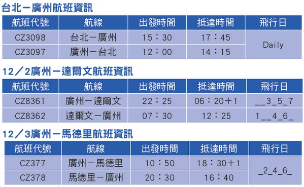 中國南方航空台灣分公司銷售經理蘭虹表示,南航台北—廣州11、12月的每週三、五、日,將機型調換升級為B777-300ER,並配有商務艙、明珠經濟艙、經濟艙的3艙布局,讓飛行更享受舒適,同時也讓旅客透過廣州綿密的航網布局,輕鬆中轉至多個內陸航點及全球熱門目的地。值得一提的是,所有從台北出發經由廣州中轉的航班,均享有一票到底、行李直掛的服務。而在新開航產品與權益方面,南航台北分公司亦將針對2條新開航線的首月航班推出優惠票價,旅客可通過南航官網和指定合作管道購買,歡迎同業多加利用。
