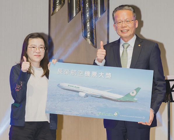 ▲長榮航空總經理孫嘉明(右)抽出當晚最大獎─全球不限航點商務艙機票,恭喜得獎者五福旅行社張毓純。