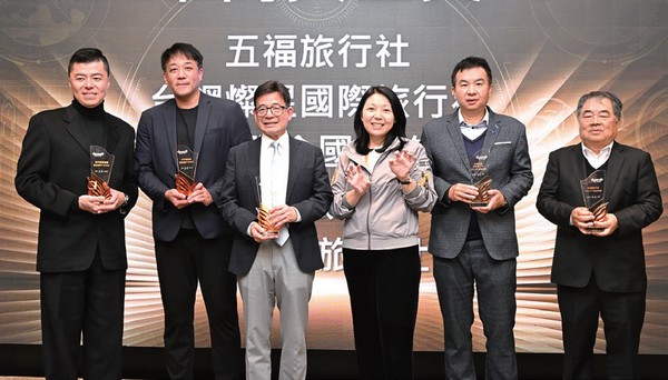 ▲台灣虎航董事長黃世惠(左4)頒發千萬美金獎給予旅遊家旅行社、華泰旅遊、旅天下聯合國際旅行社、台鋼燦星國際旅行社、五福旅遊。