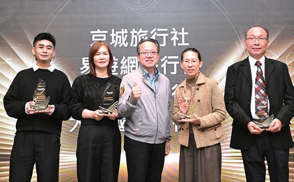 ▲台灣虎航協理林巧婉(中)頒發百萬美金獎給予株式会社ワールドコンパス、雄獅旅遊高雄分公司、易飛網、新晨旅行社。