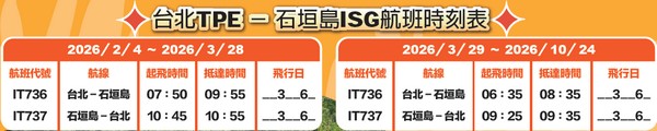 台灣虎航營業發展部實體通路組組長楊栢源表示,石垣島地理位置優異,透過台虎的直飛航班僅需1小時便能抵達,是台灣旅客最接近日本的一次。而從去年7月∼10月的航線裝載率來看,平均載客率超過9成,是近期旅客訪日的熱門首選。因此,持續看好今年市場發展,台虎從2/4開始,規畫每週2班的飛行(週三、六),並預計在6/2起增班至每週4班(週二、三、五、六),為暑假及家庭旅遊市場提供更高彈性。