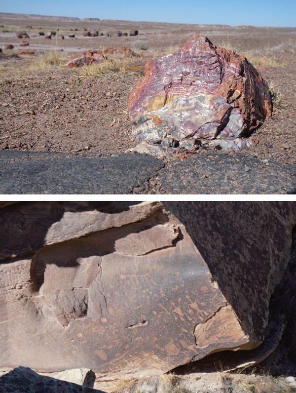 亞利桑那州石化林國家公園,擁有世界上最大的矽化木群,主要形成於約2億年前的晚三疊世。樹木被火山灰等掩埋隔絕氧氣形成矽化木,矽化過程中混入的雜質元素賦予化石多變色彩。這裡除了著名的彩繪沙漠(Painted Desert)外,還有猶如月球表面的Blue Mesa Trail的地層步道,還有由650至2,000年前生活在普埃科河沿岸的祖傳普韋布洛人(Ancestral Puebloan)所創作「報紙岩」(Newspaper Rock),被譽為「跨世代的雕刻」(Work of Generations),展現了深厚的歷史底蘊。