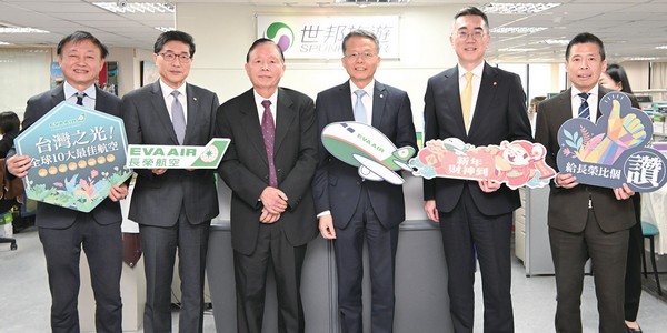 ▲(前排左3起)百威旅遊總經理吳再裕、董事長蘇志斌、長榮航空總經理孫嘉明、首席副總經理廖至維、客運營業本部副總經理王振興、營業部協理林玄修。