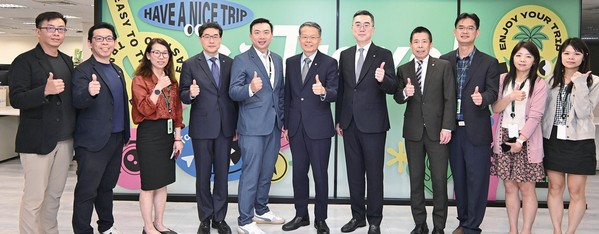 ▲(左2起)長榮航空客運營業本部副總經理王振興、首席副總經理廖至維、喜鴻假期董事長葉友芳、長榮航空總經理孫嘉明、喜鴻假期執行副總藍一晴、副總經理鄭詩涵、長榮航空客運營業本部營業部協理林玄修。