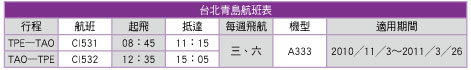 ● AE989╱AE990台北—寧波,從11╱1起,將由現行每週3班,增為每週4班,新增每週四(週一、三、四、六)。