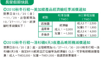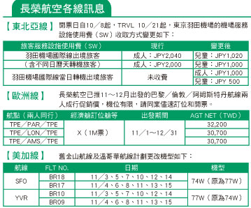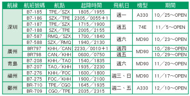 長榮╱立榮航空宣布自10╱23起,陸續增加大陸線航班,見下表,請同業多加利用。其中預計12╱10開航鄭州,每週2班:週二與週五,下午去、夜晚回,機型採用A330,票價訂定較首都北京略低,將與湖北武漢接近,長榮針對首航將推出特惠促銷。