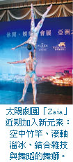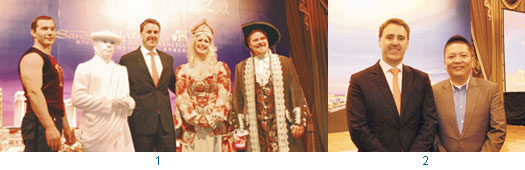 1.金沙中國銷售及市場發展副總裁白易禮(中)與太陽劇團、澳門威尼斯人表演工作者合影。2.(左起)金沙中國銷售及市場發展副總裁白易禮、太陽劇團銷售部總監應頌恩。