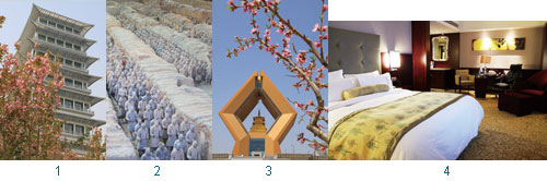 1.西安世園會地標建築長安塔。2. 世界八大奇觀兵馬俑一直都是造訪西安的必遊景點。3.法門寺的合十舍利塔是由台灣知名建築師李祖原操刀設計。4.2010年開幕的新興戴斯酒店擁有寬敞舒適的客房空間。