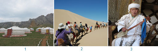 1.蒙古包度假村溫暖舒適。2.響沙灣騎駱駝。3.傳統蒙古音樂表演,令人疵醉