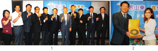 1.(左起)山東省旅遊行業協會理事長林存瑛、棗庄市旅遊和服務業發展委員會主任劉中波、山東省旅遊局國際旅遊市場開發處副處長王榮國、台北市觀光傳播局副局長邱蓬新、青島啤酒公司董事長金志國、山東省旅遊局局長于衝、台灣觀光協會會長周慶雄、東南旅行社總經理李清松、淄博市旅遊局局長常傳喜、長榮航空港澳大陸課課長馬瑜光、中華航空台北分公司客運營業部副理羅俊英。 2.山東省旅遊局國際旅遊市場開發副處長王榮國(左)致贈85度C公關部總監鍾靜如紀念禮。