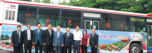 ▲(左起)淄博市旅遊局局長常傳喜、台北市觀光傳播局副局長邱蓬新、山東省旅遊局國際旅遊市場開發處副處長王榮國、東南旅行社總經理李清松、台灣觀光協會會長周慶雄、山東省旅遊局局長于衝、棗庄市旅遊和服務業發展委員會主任劉中波、山東省旅遊行業協會理事長林存瑛、東南旅行社大陸旅行事業本部副總經理許永裕合影於「好客山東.真情東南」公車車體廣告前。