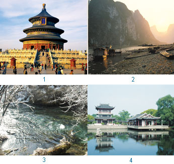 1.北京天壇。2.夢幻的灕江山水。3.人間仙境─九寨溝。4.江南水鄉風光。