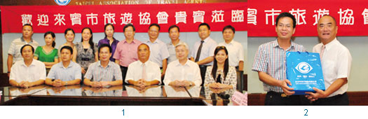 1.廣西來賓市代表團與北市旅行商業同業公會幹部合影。2. 廣西來賓市旅遊行業協會副會長韋宇(左)與北市旅行商業同業公會副理事長丁萊交換禮物。