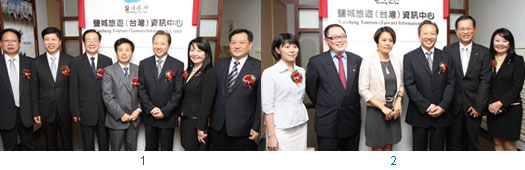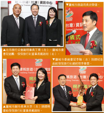 1.鹽城旅遊(台灣)資訊中心揭牌儀式,(左起)鹽城市副市長曹友琥、副市長章大李、台灣觀光協會名譽會長張學勞、海旅會台北辦事處副主任陳成忠、鹽城市委書記趙鵬、保保旅行社董事長戴啟珩、鹽城市委副書記李馳。2.兩岸航空公司共襄盛舉,(左起)長榮航空客運本部營業部直客行銷課陳維琪、東航台灣分公司總監方南海 總經理周瑩、鹽城市委書記趙鵬、華航台灣地區處長兼台北分公司總經理孫鴻文、保保旅行社董事長戴啟珩。