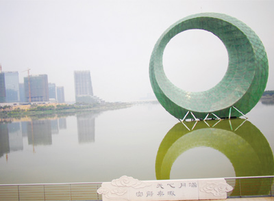 ▲園博苑中的海中月光環,夜晚利用LED變換風貌,美麗不已。
