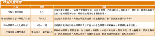 呼倫貝爾市旅遊局副局長曹宏煜表示,近年呼倫貝爾受到世界各地旅客的關注,旅遊產業也成為當地支柱產業,2011年全市旅遊接待突破1165萬人次,同比增長 19%,旅遊收入達到173億元人民幣,同比增長21%,近年也均以每年20%速度增長,2012年計劃吸引1400多萬人、達成 200多億收入的目標,為此擬訂許多辦法措施,例如新增航線,繼去年開通香港航點之後,今年則將延伸至台灣,開通台灣包機,因此希望透過台灣同業實地考察,發掘呼倫貝爾的旅遊資源,為當地注入活水。