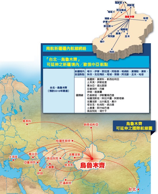 中國南方航空將自2013年,開通「台北 ─烏魯木齊」直航航班,將採用波音757執飛,飛行時間約6個小時可抵新疆。而經由目前南航自烏魯木齊延伸的主要旅遊熱點為俄羅斯莫斯科╱新西伯利亞、土耳其伊斯坦堡、伊朗德黑蘭、巴基斯坦伊斯蘭馬巴德、烏茲別克塔什干、吉爾吉斯比什凱克╱奧什、哈薩克斯坦阿拉木圖╱阿斯塔納、塔吉克杜尚別╱胡占德、土庫曼阿什哈巴德、喬治亞提比里斯、亞塞拜然巴庫等飛往俄羅斯、土耳其及中亞各國國際航線共有15條航線;另外,在新疆境內的航點,也囊括了喀什、伊寧、那拉提、阿勒泰、喀納斯、庫爾勒、庫車、和田等主要旅遊熱門航線。