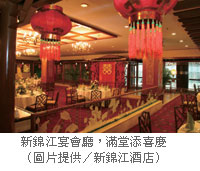 新錦江的各式宴會和餐廳也可謂風格多樣,獨具特色。1樓鬱金香廳色調和諧溫馨;4樓以上海市花「白玉蘭」命名的宴會廳,古典氣派、富麗堂皇,氣勢宏偉,真是滿堂添喜慶,全家喜團圓;3樓竹園餐廳的包間更是舉家團圓的好場所,所謂年年慶有餘,群仙賀新年;34樓行政樓格局高貴典雅,舒適安靜的環境讓人留戀往返,感覺滿園春色,富貴有餘。老上海餐廳、藍天旋轉餐廳則帶著典型的中式風格,尤其是位於41層的藍天旋轉餐廳,新年登高遠眺,飽覽申城美景將別有一番風味。