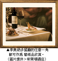 位於上海希爾頓酒店的李奧納多餐廳是一家歷史久遠、有著濃郁藝術氛圍的餐廳。明亮的燭光在黃昏的餐廳裡搖曳,映亮淡橙色壁紙上那數十幅達文西的畫作摹本。年輕的畫師將餐廳視為畫廊,神情專注於手中的油畫創作。桌上絢爛悅目的百合與飾有三色花的橙色羊毛地毯相映成趣。