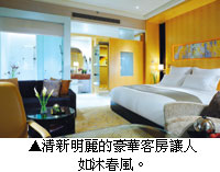 位於飯店中高層區域的豪華客房是新一輪設施改造後誕生的全新房型,客房內的設計裝飾風格沿襲了行政客房的基本格調:沉穩而不失豪華的棕褐色系;頗有居家感的床上用品;富含文化氣息的藝術壁掛。26英吋液晶電視、快速便捷的寬帶上網、國際長途直撥電話、全天候衛星電視和24小時客房送餐服務等一應俱全。