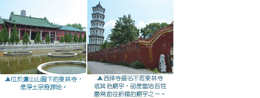 九江市廬山西邊山腳下,有兩座佔地不廣、名氣亦不挺大的兩間廟宇,然看似普通的小廟,卻各自有其深遠影響。其中東林寺由東晉慧遠法師創寺建立,並在此率眾修習淨土宗,使其成為淨土宗發源地,而這也是形塑佛教中國化極重要的歷史過程。雖然後來中國佛教漸以禪宗為主流,東林寺仍吸引數萬日本淨土宗信仰者到此朝拜。緊鄰東林寺不遠處的西琳寺,比東林寺早建9年,在佛教界影響力不如東林寺,卻是紮紮實實最常民而真實的佛教廟宇。西琳寺在中國詩學、文化界更享有盛名,原來宋代蘇軾曾借住於此,並提筆寫下婦孺皆知、膾炙人口的「題西林壁」一詩,其丑u不識廬山真面目,只緣身在此山中」詞句,不僅精妙點出廬山雲霧飄渺之美,也引發更多文人墨客為廬山留下詩句,而奠定廬山日後在文學、文化中重要地位。
