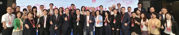 ▲(第1排左6起)江西省文化和旅遊廳黨組成員兼副廳長周建文、台灣商業總會理事長許舒博、全國台企聯榮譽會長(錫山家具集團董事長)王屏生和與會者合影留念。