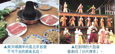 他提到,正因為北京產品的內容豐富且觀光元素持續更新,近年來「中國泰斗」回流的客人比率仍有相當增長,以「2008奧運看北京溫泉美食6日」而言,就特別安排「北京之夜」晚宴劇場,融合中國傳統音樂、舞蹈、戲劇、雜技及少數民族風情的藝術形式,是顧客相當滿意的節目,巴國布衣餐廳的川劇變臉秀表演,是一項吃美味也看開心的創意行程,紅劇場的大型演藝劇目「功夫傳奇」亦是不容錯過的精采節目。