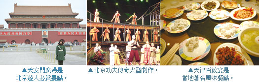 福洋國際旅行社董事長唐福表示,本季以「2008奧運看北京」為行銷主標的產品,有5日~8日的3款行程,遊客可全覽北京、承德、天津名勝或是遊歷純北京文化特色。行程安排上「北京之夜」晚宴劇場,是融合中國傳統音樂、舞蹈、戲劇、雜技及少數民族風情的藝術形式,票價約在台幣1,000元左右,也是業者吸收不另增為自費。到了巴國布衣餐廳的川劇變臉秀表演,可以讓表演者和遊客做近距離的互動,也是招牌行程之一。紅劇場的大型演藝劇目「功夫傳奇」更是遊客不容錯過的大型演出。響應北京奧運的熱潮,也帶領遊客到奧運會場鳥巢與泳賽主場水立方進行外觀巡禮。住宿搭配五星級北京喜來登長城飯店,8日遊部分會再加進承德避暑山莊、小布達拉宮探訪,到了天津則是有天后宮、食品街、古文化一條街及租界文化區遊歷的豐富景區安排。