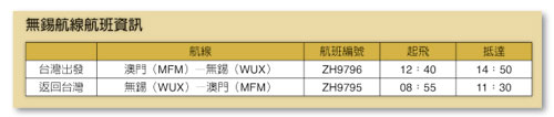深圳航空無錫航線採用最新波音737-800豪華噴射客機,備有8個商務艙及152席經濟艙。在所有的訂位系統ABACUS、ETERM…等均可訂位。台灣—澳門前段可自由搭配復興航空、長榮航空、澳門航空,除了搭配轉機方便之外,票價結構更是優惠中的優惠,享有比上海還優惠的價格,復飛優惠票價無錫來回只要9,500元,4段商務艙也只要19,500元。除了地理位置的方便外,票價更是優惠,加上免費接駁前往蘇州只要30分鐘就可抵達,比起壅塞的上海滬寧高速公路,絕對是旅客最大的福音,歡迎同業推廣運用。