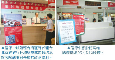 由於目前信德中旅船務在桃園機場與小港機場2個國際機場都有專人為旅客介紹並處理訂購的相關事宜,於商務客而言,便利性倍增,且不用一定到台北國旅旅行社才能購買相關產品,於機場就能直接購買快速噴射飛船的服務,結合信德中旅船務提供的一站式交通接駁機制,如銜接航空公司行李業務的相關合作,就可以讓遊客的行李一次託運,後段順利直掛到噴射飛船所到的各目的地,為遊客省下許多無謂的時間耗費。