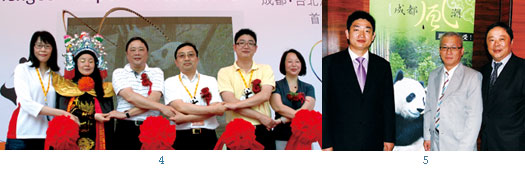4.「成都—台北海峽兩岸首屆熊貓節」於5╱23在信義新天地香堤大道廣場開幕,現場展示精采的貓熊攝影與成都旅遊圖片,並推廣多樣旅遊商品,活動由(左起)成都文化旅遊發展集團台灣代表—雄獅旅行社大陸港澳部協理劉鳳鳴、川劇變臉表演者、雄獅旅行社總經理劉文義、四川省旅遊局副局長陳加林、中國國際航空台灣辦事處總經理張允、熊貓旅遊集團總經理張維到場共同剪綵。