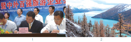1. 西南旅行社總經理李逸(中)簽署萬人遊新疆旅遊合作協議書。