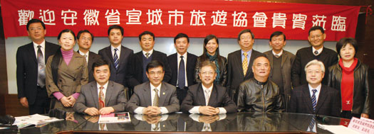 安徽省宣城市旅遊局拜會北市旅行公會,(前排左2、3)安徽省宣城市旅遊局副局長劉新生、北市旅行公會理事長許禓哲。