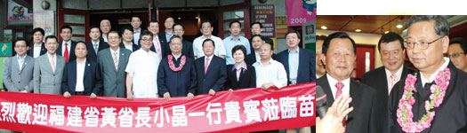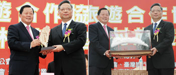 苗栗縣縣長劉政鴻(左)與福建省省長黃小晶互相致贈禮物,開啟閩台觀光新歷程。