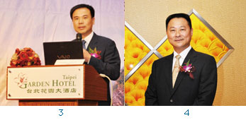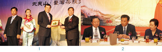 1.南平、武夷山.台灣茶旅交流會,南平市人大副主任陳岩生(右1)與旅行商業同業公會台灣省聯合會理事長蕭博仁(右2)互贈禮物。2.南平、武夷山‧台灣茶旅交流會宴請台灣旅遊、商業、茶業界人士,左1為台達電董事長鄭崇華。3.武夷山市政府市長胡書仁介紹武夷山的旅遊特色。4.武夷山市旅遊局局長季和賓。