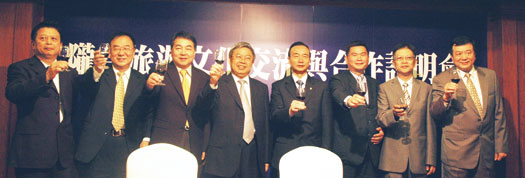▲(左起)中華兩岸旅行協會理事長許晉睿、甘肅省旅遊協會會長黃周會、交通部觀光局副局長謝謂君、甘肅省副省長劉永富、海旅會台灣辦事處主任范貴山、品保協會理事長林進榮、台北市旅行商業同業公會理事長許禓哲及旅行商業同業公會台灣省聯合會理事長蕭博仁,於說明會上共同舉杯為隴台觀光嶄新里程碑慶賀。