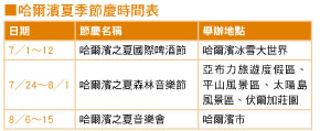 入選為「中國首批旅遊城市」與「中國十大最具特色旅遊城市」的哈爾濱,近年來極力推廣「哈夏之旅」,成功奠定了「避暑勝地」、「生態王國」的旅遊品牌,陸續舉辦的旅遊文化節、國際經貿洽談會、國際啤酒節、森林音樂節、哈爾濱之夏音樂會、二龍山金秋節、橫頭山紅葉節等節慶活動,讓哈爾濱一點也不無聊。