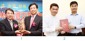 1.吉林省副省長陳偉根(右)與觀光局副局長謝謂君互贈禮物紀念。