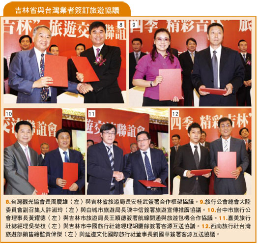▲(左起)雲林旅行公會理事長莊龍江、台中市旅行公會理事長黃耀德、省聯合會理事長蕭博仁、吉林省旅遊局長安桂武、吉林省政府副秘書長叢紅霞、旅行公會總會理事長姚大光、金門縣旅行公會理事長吳嘉獎、澎湖縣旅行公會理事長張東周、苗栗縣旅行公會理事長王全財。