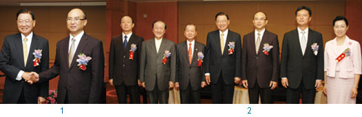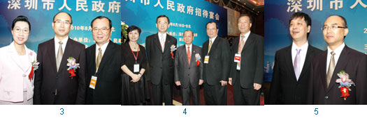 1.海基會董事長江丙坤(左)與深圳人民市政府市長許勤。2.(左2起)新黨黨主席郁慕明、商業總會理事長張平沼、海基會董事長江丙坤、深圳市人民政府市長許勤╱副市長張文、深圳市委員會副主席林潔。3.(左起)深圳市委員會副主席林潔、深圳市人民政府市長許勤、旅館旅行業國際行銷協會理事長蘇乾亮。4.與會貴賓合影商業總會常務理事王應傑(左2)╱理事長張平沼(中)、旅館旅行業國際行銷協會理事長蘇乾亮(右2)。5.深圳海王集團董事長(左)與深圳市人民政府市長許勤。