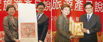 ▲台灣海峽兩岸觀光旅遊協會會長賴瑟珍(左)與南京市副市長陳剛相互致贈禮品。