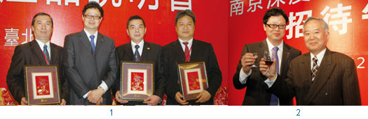 1.南京市副市長陳剛(左2)頒發感謝牌給台灣康福、東南及行家旅行社。