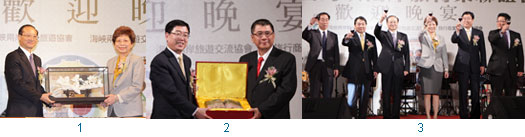 1.台灣觀光局長賴瑟珍(右)與中國國家旅遊局長邵琪偉互贈禮物。